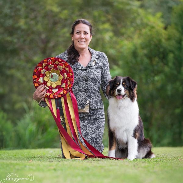 An outstanding female Australian Shepherd and multiple Best in Show winner, Supreme Champion Blueamble Such A Flirt is a true star of the show ring. A happy-go-lucky girl with undeniable charm, she wins hearts instantly wherever she goes. Bred from generations of Supreme Champions, she boasts breathtaking movement that sets her apart. Her consistent success under both local and international judges has cemented her as an influential and unforgettable presence in the breed