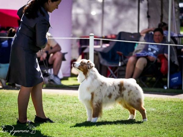 A striking young red merle male Australian Shepherd, this dog combines outstanding ring presence with the sweetest and most affectionate temperament. Confident and happy when performing, he truly loves his time in the show ring, consistently presenting himself with style and enthusiasm.